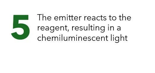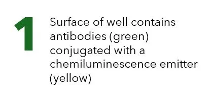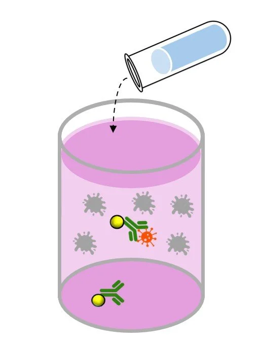 Here is a step-by-step diagram of how a typical All-In-One immunoassay would be processed in a lab. Notice that there are no washing steps, and the antibody binding occurs in-liquid (not on the bottom surface of the well). The entire process can take as little as 5 minutes.