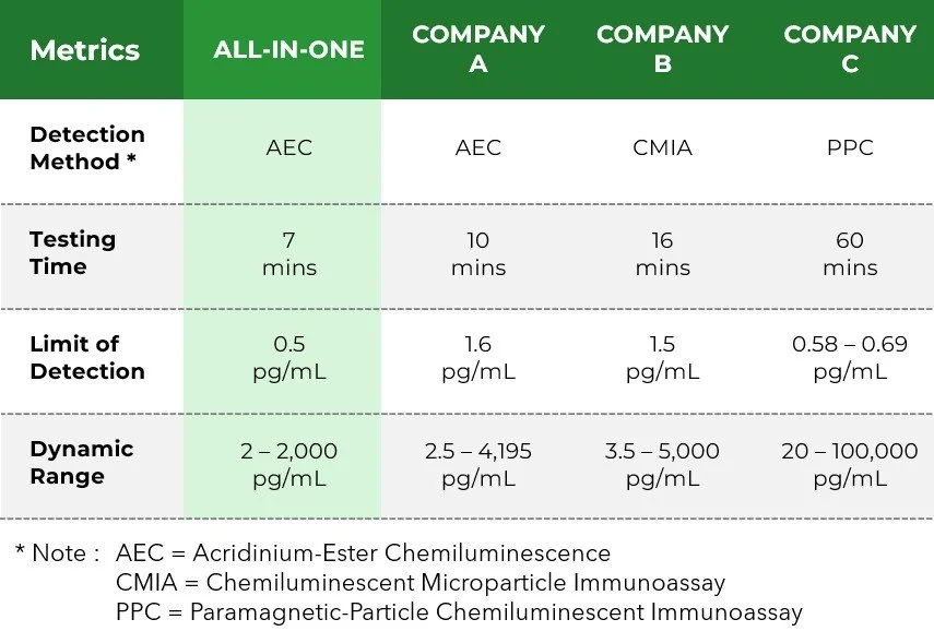 Here is a performance comparison of how our All-In-One immunoassay kit competes with 3 established products in the market.